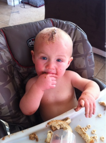 "Daddy gives me nutella and peanut butter sandwiches for breakfast!!!" He ends up with it all over himself most of the time.